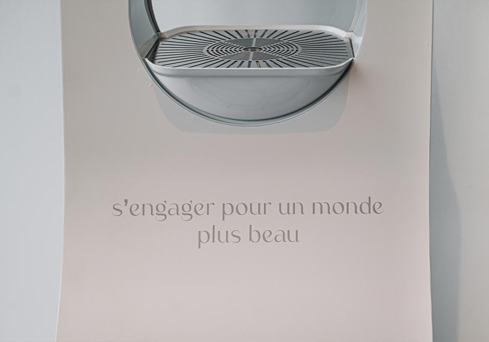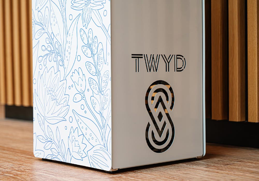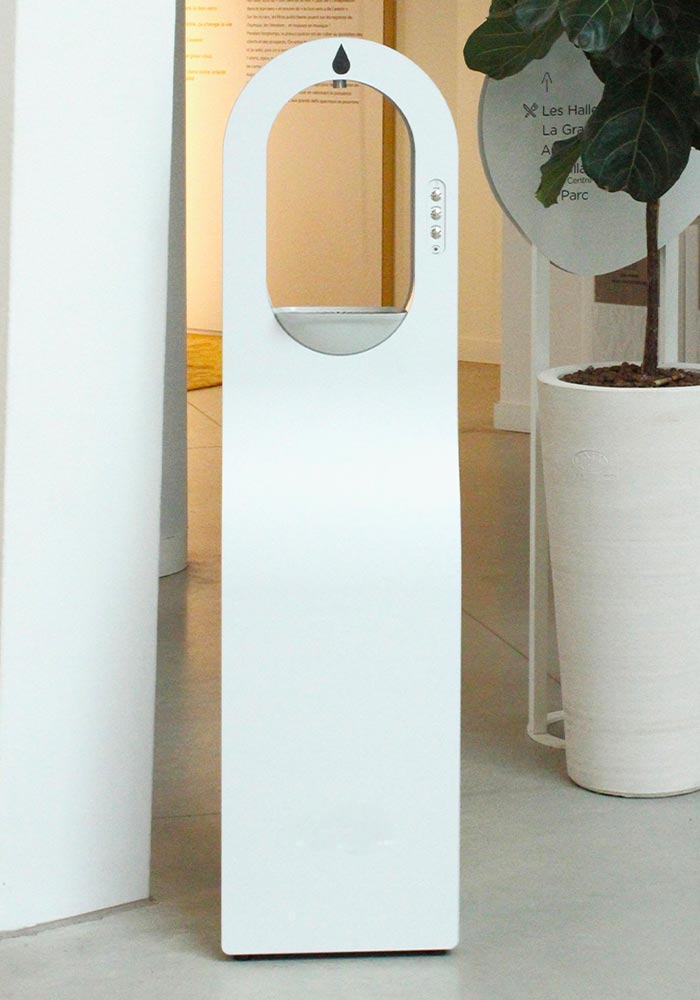 Entièrement personnalisables (habillage, couleurs, visuels, messages), les fontaines sur pied Twyd deviennent un véritable support de communication au sein de vos espaces.